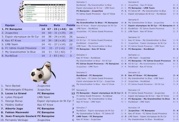 Lire aussi : Acte I Acte II Acte III Acte IV Acte V Acte VI Saison actuelle ![]() Après 13 saisons d'activité, le Projet Renaissance n'est plus. Face à la difficulté à retrouver la D.II avec un effectif vieillissant, il était temps de repartir sur un nouveau cycle. Mais pas de projet sportif bien précis pour le moment, le club préfère en effet attendre le bon moment pour monter une nouvelle génération, qui pourrait être basée sur des espoirs de la Juventus (rêvons un peu). Le nouveau projet un peu fou du club le plus givré est de former de futurs internationaux au poste d'ailier, en attendant la suite. Le premier objectif de ce projet est de permettre à ces 4 ailiers (H. Yeghoyan, É. Rouquie, MJ. Hoogmoed, JF. Goulard) d'être sélectionnés dans leurs équipes U21 respectives. Les pingouins entament leur deuxième saison dans la III.2, avec une équipe qui perdra progressivement ses anciens cadres, remplacés par un mélange de jeunes ailiers, joueurs d'expérience futurs coachs, et quelques bons joueurs profitant d'un peu d'entraînement. Le niveau de l'équipe ne fera que chuter, son classement également. Les pingouins termineront donc la saison à la dernière place, sans illusion. ![]() Avec un effectif jugé trop faible pour batailler en ligue (même après la relégation) et en Coupe de France, le FCB aborde cette nouvelle saison sans objectif réel. Le but reste avant tout de faire progresser les recrues (les 4 ailiers et les 4 autres joueurs bénéficiant d'entraînement). Les pingouins sauvent l'honneur en évitant la dernière place en ligue et en atteignant le 6ème tour de Coupe de France. ![]() Pour cette première saison en division V, le FCB n'est pas aussi ambitieux que ses supporters, et vise simplement le maintien, le niveau de l'équipe étant encore une fois jugé trop faible. Après une saison irrégulière, marquée notamment par quelques mauvaises surprises à domicile, les pingouins terminent à la 3ème place (avec encore une fois 6 tours de Coupe de France). ![]() Avec des performances en progression, le FCB se donne un peu d'ambition en cette nouvelle saison : décrocher le titre de champion de V.9, tout en continuant à atteindre le 6ème tour en Coupe de France. Ces objectifs ont été atteints (et même dépassés) avec la manière : les pingouins sont champions avec montée directe (13 victoires, 1 défaite) et atteignent le 7ème tour de Coupe. ![]() En retrouvant la D.IV, les pingouins souhaitaient s'y maintenir, même après barrage. Le début de saison leur faisait espérer le top 4, et après avoir occupé très longtemps la 2ème place, ils finirent à une 3ème place satisfaisante (avec un nouveau 7ème tour de Coupe de France). ![]() Pour cette 2ème saison en IV.37, les pingouins visaient le maintien, si possible direct. Ils ne se sont jamais vraiment fait peur, occupant le top 4 sans interruption dès la 3ème journée, pour terminer une nouvelle fois à la 3ème place (avec 6 tours de Coupe de France joués). ![]() Avec un plan d'entraînement ne permettant pas de jouer le sportif, les pingouins abordaient cette nouvelle saison en IV.37 sans ambition de classement, le maintien, même après barrage, semblant improbable. L'intuition était bonne, le club nordique occupant toute la saison la partie basse du tableau, terminant derniers. ![]() De retour en D.V, les pingouins, conscients de leurs limites, se contentaient du maintien comme objectif. En effet, le plan d'entraînement n'est toujours pas adapté à la performance sportive, et il est plus sage de mûrir quelques saisons en D.V. Pourtant, le FCB réussit à entrer dans la lutte pour le titre de champion jusqu'à la dernière journée, terminant à la 2ème place (avec 7 tours de Coupe de France joués). ![]() Avec un niveau jugé encore insuffisant pour jouer la montée vers la D.IV, les pingouins visaient le maintien direct pour cette nouvelle saison en D.V. Pourtant, le FCB a occupé la 1ère place en continu à partir de la 4ème journée, terminant champion avec la montée directe en D.IV (avec 6 tours de Coupe de France joués). ![]() L'objectif du club pour ce retour en D.IV était le maintien. Les pingouins n'ont jamais vraiment été inquiétés dans cet objectif, se classant toute la saison dans le top 5, et même 13 journées dans le top 4, très vite hors de portée des deux derniers, si bien que le maintien direct devint assez vite le nouvel objectif. Un objectif rempli avec une 3ème place, à 2 points du premier (avec 6 tours de Coupe de France joués). ![]() Pour cette 2ème saison en IV.64, les pingouins souhaitaient rééditer une place dans le top 3, malgré une concurrence plus forte. Le club se stabilisait assez vite en milieu de tableau, atteignant parfois la 3ème place, mais devait finalement se contenter de la 4ème place. ![]() Les pingouins confirment leur position d'équipe de haut de tableau de IV.64. Le club nordique n'aura jamais quitté le top 3, occupant même brièvement la 1ère place en début de saison, mais assez rapidement distancé dans la lutte pour le titre. La 2ème place sera défendue jusqu'à la dernière journée. ![]() Avec une masse salariale devenant inadaptée à la D.IV, les pingouins n'avaient d'autre choix que réussir de beaux parcours en Coupe comme en Ligue. Malheureusement, un manque de réussite associé à une hausse du niveau de la concurrence ont mis à mal cet objectif. Le club nordique termine la saison à une décevante 5ème place, avec des comptes dans le rouge, déclenchant le début d'un dégraissage nécessaire. ![]() Après une saison décevante par rapport à la masse salariale du club, les pingouins devaient réagir. Le bon parcours en Coupe de France (8 tours) a permis de créer une bonne dynamique en Ligue, où le FCB a occupé la 2ème place en continu de la 3ème à la dernière journée. La marche était trop haute pour viser la première place, et le club peut être satisfait d'avoir terminé de