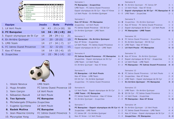 Lire aussi : Acte I Acte II Acte III Acte IV Acte V Acte VI Saison actuelle ![]() Après 13 saisons d'activité, le Projet Renaissance n'est plus. Face à la difficulté à retrouver la D.II avec un effectif vieillissant, il était temps de repartir sur un nouveau cycle. Le nouveau projet un peu fou du club le plus givré est de former de futurs internationaux au poste d'ailier, avec, comme premier objectif, de permettre à ces 4 ailiers (H. Yeghoyan, É. Rouquie, MJ. Hoogmoed, JF. Goulard) d'être sélectionnés dans leurs équipes U21 respectives. Les pingouins entament leur deuxième saison dans la III.2, avec une équipe qui perdra progressivement ses anciens cadres, remplacés par un mélange de jeunes ailiers, joueurs d'expérience futurs coachs, et quelques bons joueurs profitant d'un peu d'entraînement. Le niveau de l'équipe ne fera que chuter, son classement également. Les pingouins termineront donc la saison à la dernière place, sans illusion. ![]() Avec un effectif jugé trop faible pour batailler en ligue (même après la relégation) et en Coupe de France, le FCB aborde cette nouvelle saison sans objectif réel. Le but reste avant tout de faire progresser les recrues (les 4 ailiers et les 4 autres joueurs bénéficiant d'entraînement). Les pingouins sauvent l'honneur en évitant la dernière place. ![]() Pour cette première saison en division V, le FCB n'est pas aussi ambitieux que ses supporters, et vise simplement le maintien, le niveau de l'équipe étant encore une fois jugé trop faible. Après une saison irrégulière, marquée notamment par quelques mauvaises surprises à domicile, les pingouins terminent à la 3ème place. ![]() Avec des performances en progression, le FCB se donne un peu d'ambition en cette nouvelle saison : décrocher le titre de champion de V.9, tout en continuant à atteindre le 6ème tour en Coupe de France. Ces objectifs ont été atteints (et même dépassés) avec la manière : les pingouins sont champions avec montée directe (13 victoires, 1 défaite) et atteignent le 7ème tour de Coupe. ![]() En retrouvant la D.IV, les pingouins souhaitaient s'y maintenir, même après barrage. Le début de saison leur faisait espérer le top 4, et après avoir occupé très longtemps la 2ème place, ils finirent à une 3ème place satisfaisante. ![]() Pour cette 2ème saison en IV.37, les pingouins visaient le maintien, si possible direct. Ils ne se sont jamais vraiment fait peur, occupant le top 4 sans interruption dès la 3ème journée, pour terminer une nouvelle fois à la 3ème place. ![]() Avec un plan d'entraînement ne permettant pas de jouer le sportif, les pingouins abordaient cette nouvelle saison en IV.37 sans ambition de classement, le maintien, même après barrage, semblant improbable. L'intuition était bonne, le club nordique occupant toute la saison la partie basse du tableau, terminant derniers. ![]() De retour en D.V, les pingouins, conscients de leurs limites, se contentaient du maintien comme objectif. En effet, le plan d'entraînement n'est toujours pas adapté à la performance sportive, et il est plus sage de mûrir quelques saisons en D.V. Pourtant, le FCB réussit à entrer dans la lutte pour le titre de champion jusqu'à la dernière journée, terminant à la 2ème place. ![]() Avec un niveau jugé encore insuffisant pour jouer la montée vers la D.IV, les pingouins visaient le maintien direct pour cette nouvelle saison en D.V. Pourtant, le FCB a occupé la 1ère place en continu à partir de la 4ème journée, terminant champion avec la montée directe en D.IV. ![]() L'objectif du club pour ce retour en D.IV était le maintien. Les pingouins n'ont jamais vraiment été inquiétés dans cet objectif, se classant toute la saison dans le top 5, et même 13 journées dans le top 4, très vite hors de portée des deux derniers, si bien que le maintien direct devint assez vite le nouvel objectif. Un objectif rempli avec une 3ème place, à 2 points du premier. ![]() Pour cette 2ème saison en IV.64, les pingouins souhaitaient rééditer une place dans le top 3, malgré une concurrence plus forte. Le club se stabilisait assez vite en milieu de tableau, atteignant parfois la 3ème place, mais devait finalement se contenter de la 4ème place. ![]() Les pingouins confirment leur position d'équipe de haut de tableau de IV.64. Le club nordique n'aura jamais quitté le top 3, occupant même brièvement la 1ère place en début de saison, mais assez rapidement distancé dans la lutte pour le titre. La 2ème place sera défendue jusqu'à la dernière journée. ![]() Avec une masse salariale devenant inadaptée à la D.IV, les pingouins n'avaient d'autre choix que réussir de beaux parcours en Coupe comme en Ligue. Malheureusement, un manque de réussite associé à une hausse du niveau de la concurrence ont mis à mal cet objectif. Le club nordique termine la saison à une décevante 5ème place, avec des comptes dans le rouge, déclenchant le début d'un dégraissage nécessaire. ![]() Après une saison décevante par rapport à la masse salariale du club, les pingouins devaient réagir. Le bon parcours en Coupe de France (8 tours) a permis de créer une bonne dynamique en Ligue, où le FCB a occupé la 2ème place en continu de la 3ème à la dernière journée. La marche était trop haute pour viser la première place, et le club peut être satisfait d'avoir terminé devant d'autres belles équipes. Cette bonne saison a permis de maintenir l'équilibre financier. ![]() Pour cette nouvelle saison, les pingouins devaient confirmer leurs bons résultats, avec un espoir de première place en ligue malgré une concurrence présente. L'objectif a été accompli sans accroc avec un titre de champion assorti d'une montée directe en D.III (le club n'a pas quitté la première place depuis la J1), bien aidé par un bon parcours en Coupe de France (7 tours). ![]() Le retour en D.III s'annonçait délicat avec une équipe vieillissante, mai